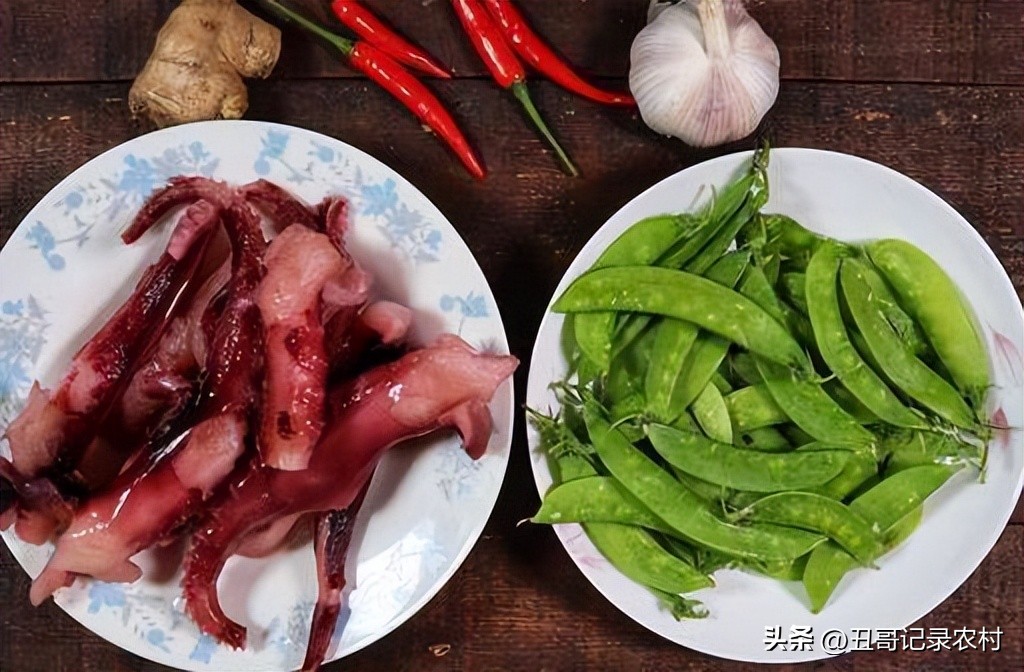 首先简单处理好准备好的食材。先把荷兰豆两边的老筋去掉,用手掰住一边即可去掉两边的老筋,去掉之后,洗干净;拿出老姜,红椒和蒜瓣,把老姜去皮冲洗一遍,然后切成一块一块的姜片,把红椒去蒂,简单清洗一下,然后把蒜瓣掰皮,清洗,拍扁或切碎待用;