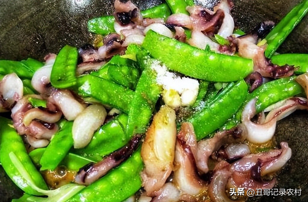 加入章鱼腿,翻炒大概一分钟,加入配料,些许白糖,些许蚝油,然后再翻炒一下,让它上色,上色完毕后加入些许清水,盖锅焖60秒,开盖加入去筋的荷兰豆,翻炒一下,让他们互相入味;