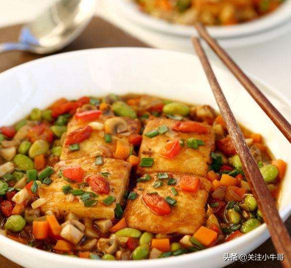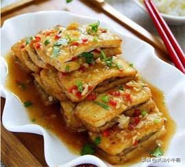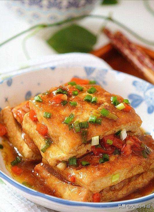 ⑥原勺加底油烧热,以葱、姜、蒜炝锅,加入鲜汤,返入煎好的豆腐盒,加盐、味精找好咸鲜口,慢火收尽汤汁出勺,用香菜段、葱丝装饰即可。