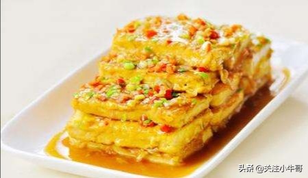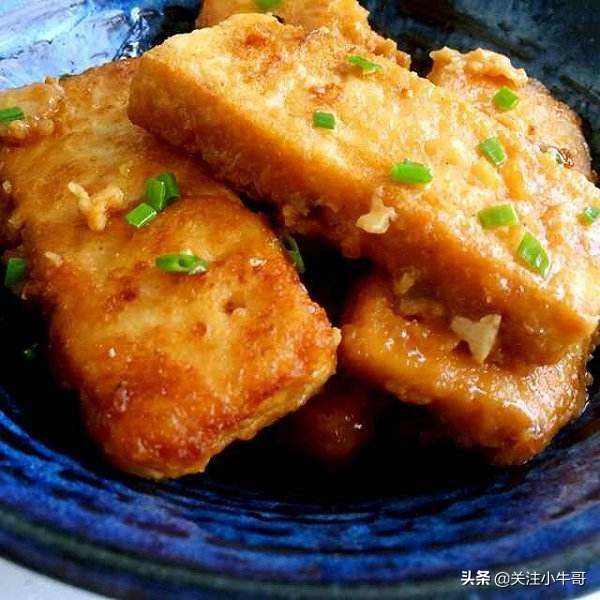 ⑤炒锅注油烧热后,将豆腐盒均匀地拖上全蛋液,整齐地摆放于勺中,用小火将两面煎至金黄色时出勺,用温水冲净油沫及杂质。